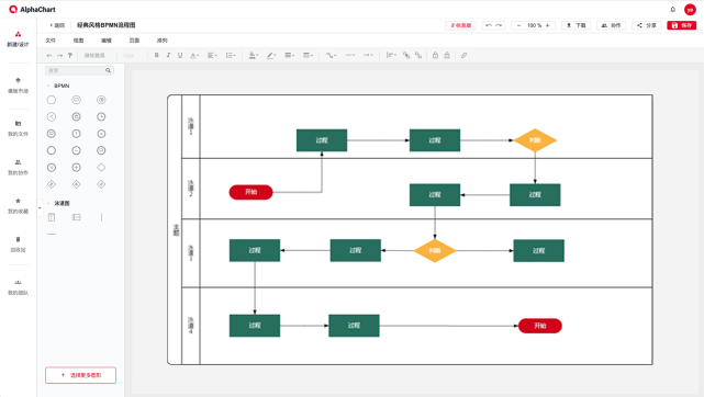在AlphaChart中每個(gè)符號(hào)都是矢量的,可以填充顏色,改變大小,定義數(shù)據(jù)和連接。在流程圖標(biāo)準(zhǔn)符號(hào)包括4個(gè)基本流程符號(hào)橢圓形、矩形、箭頭、菱形和5類中高級(jí)的流程圖符號(hào)。通用流程圖
